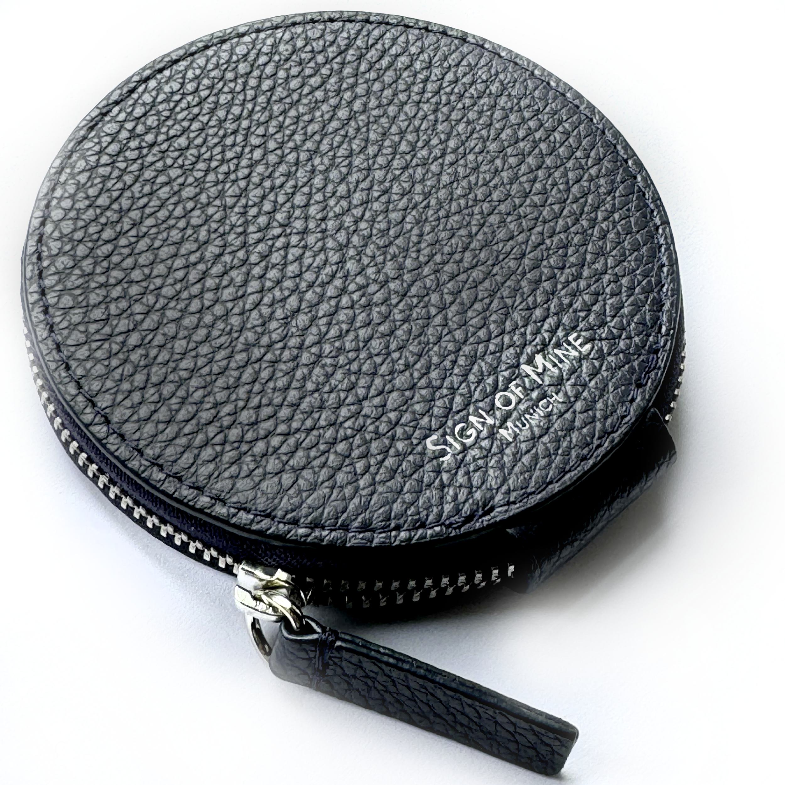 Aufwendig gestickt im coolen Retrolook ziert das Label SPIRAL BLAU das runde Etui und selbstverständlich ist es personalisierbar mit 1, 2 oder 3 Buchstaben - Ihren Initialen und es ist unverkennbar Ihres! Das runde Täschchen / Etui ist perfekt für Ladekabel, Kleingeld, AirTags und Schlüssel können an den Ring in der inneren Schlaufe befestigt werden, aber auch Visiten- und Kreditkarten passen perfekt. Unsere Ledermanufaktur fertig dieses Etui aus feinem, genarbtem Kalbsleder in Nachtblau mit einem fast rundum laufenden, silberenen Reissverschluß in der Größe 10 cm Durchmesser, 2 cm Höhe, unser Logo ist elegant in silber auf die Rückseite geprägt.