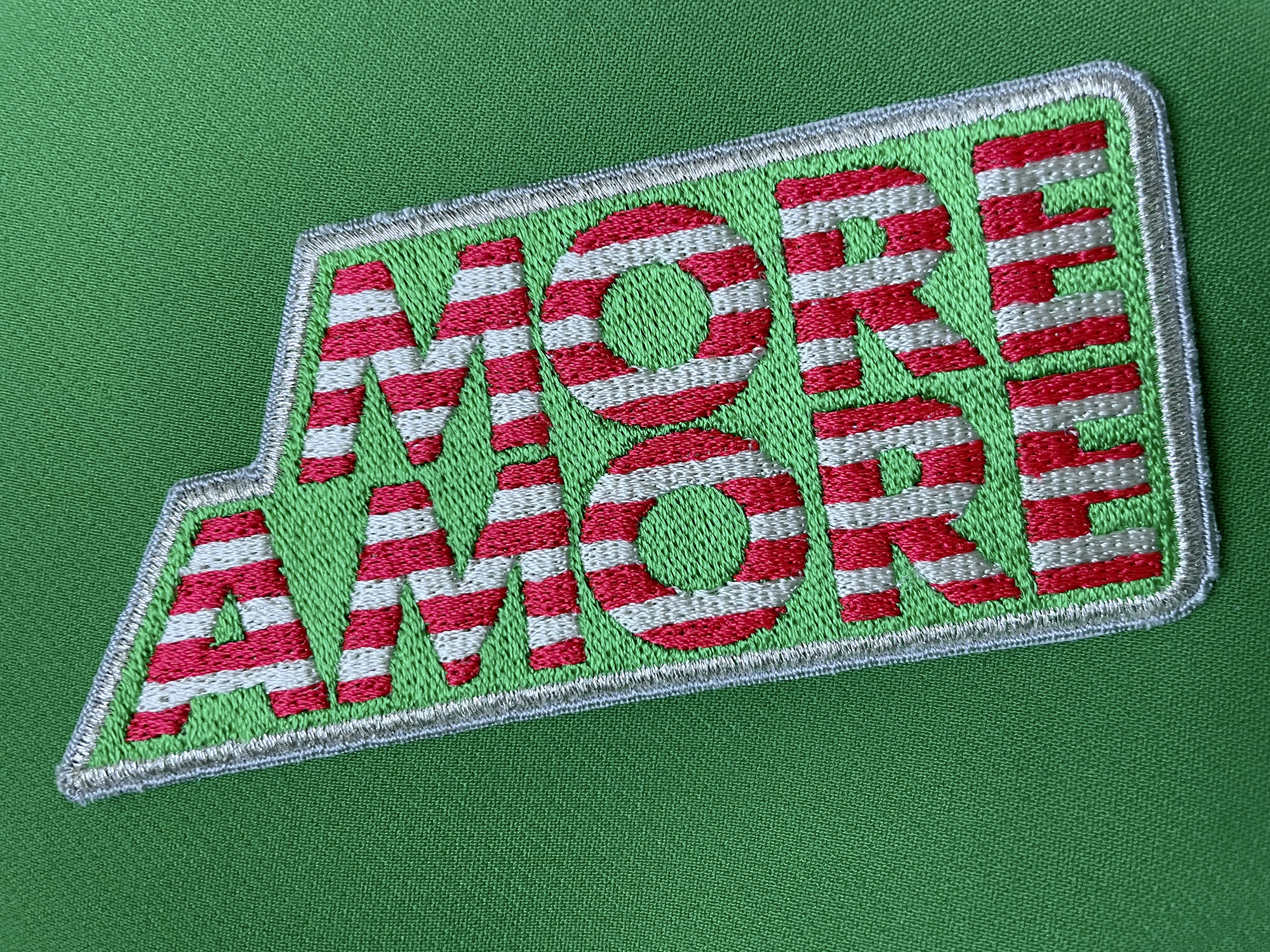 Alle we need is... MORE AMORE! ...nicht nur für Verliebte sondern für die eigene gute Laune, um mit Liebe und Geduld durch den Alltag zu kommen. Als Patch macht MORE AMORE Ihr Smartphone, Ihre Tasche, Ihr Trolley oder Laptop zum unverwechselbaren Einzelstück. Es ist 10,5 x 5 cm groß und vollflächig in den Farben von Bella Italia in Rot, Grün und Cremeweiss bestickt mit einem silbernen Rand. Die Patches machen sich auch gut auf Notizbüchern, Mappen, Laptops, Passhüllen, Foto-Alben, Lederjacken – und sind ein stylischer Blickfang. Die Stitched Labels von SIGN of MINE haften auf allen glatten, festen, sauberen, trockenen Oberflächen. Einfach die Plastikfolie auf der Rückseite abziehen, das selbstklebende Label an der gewünschten Stelle positionieren und fest andrücken. So wird aus Ihrem Accessoire im Handumdrehen ein Unikat – edel, easy und einzigartig!