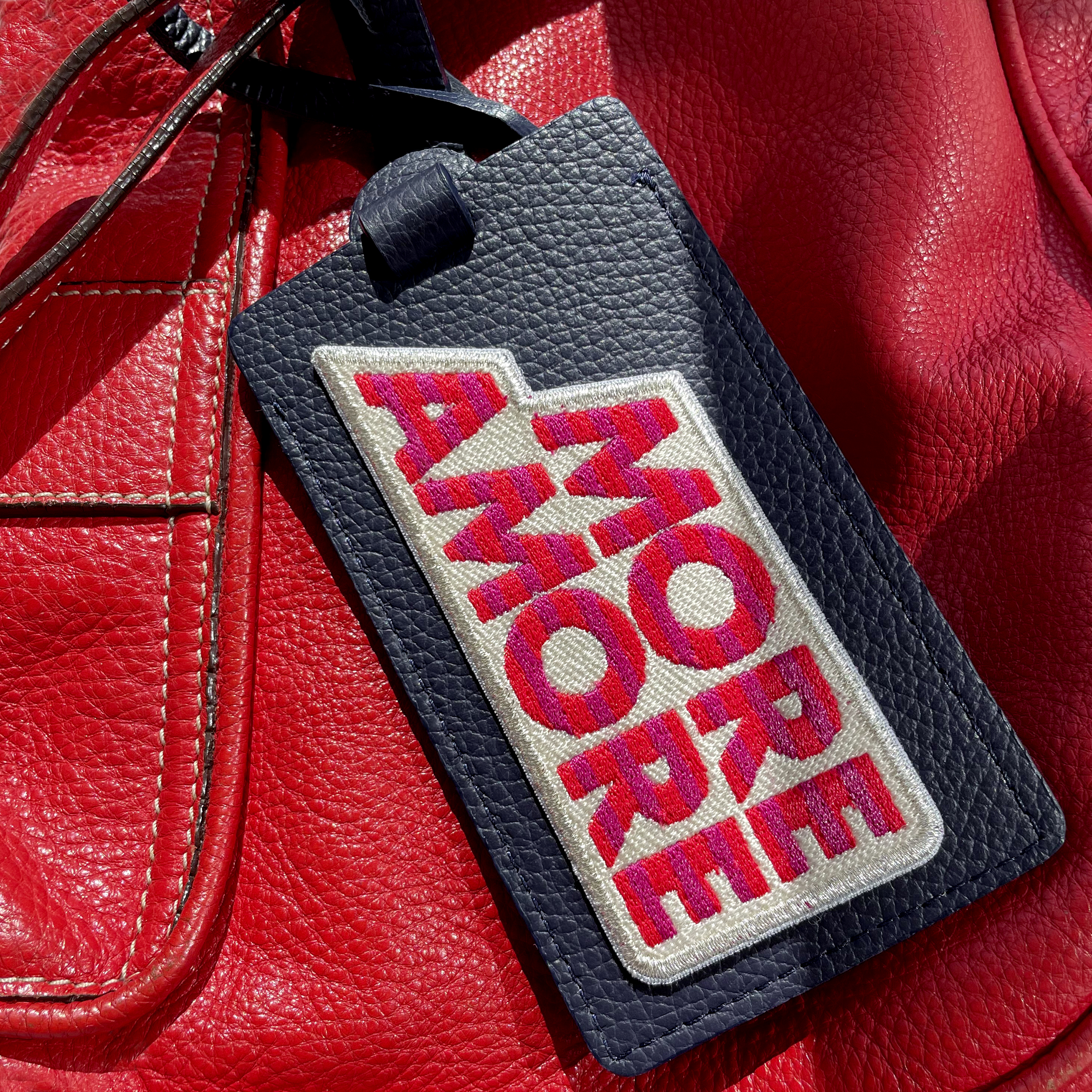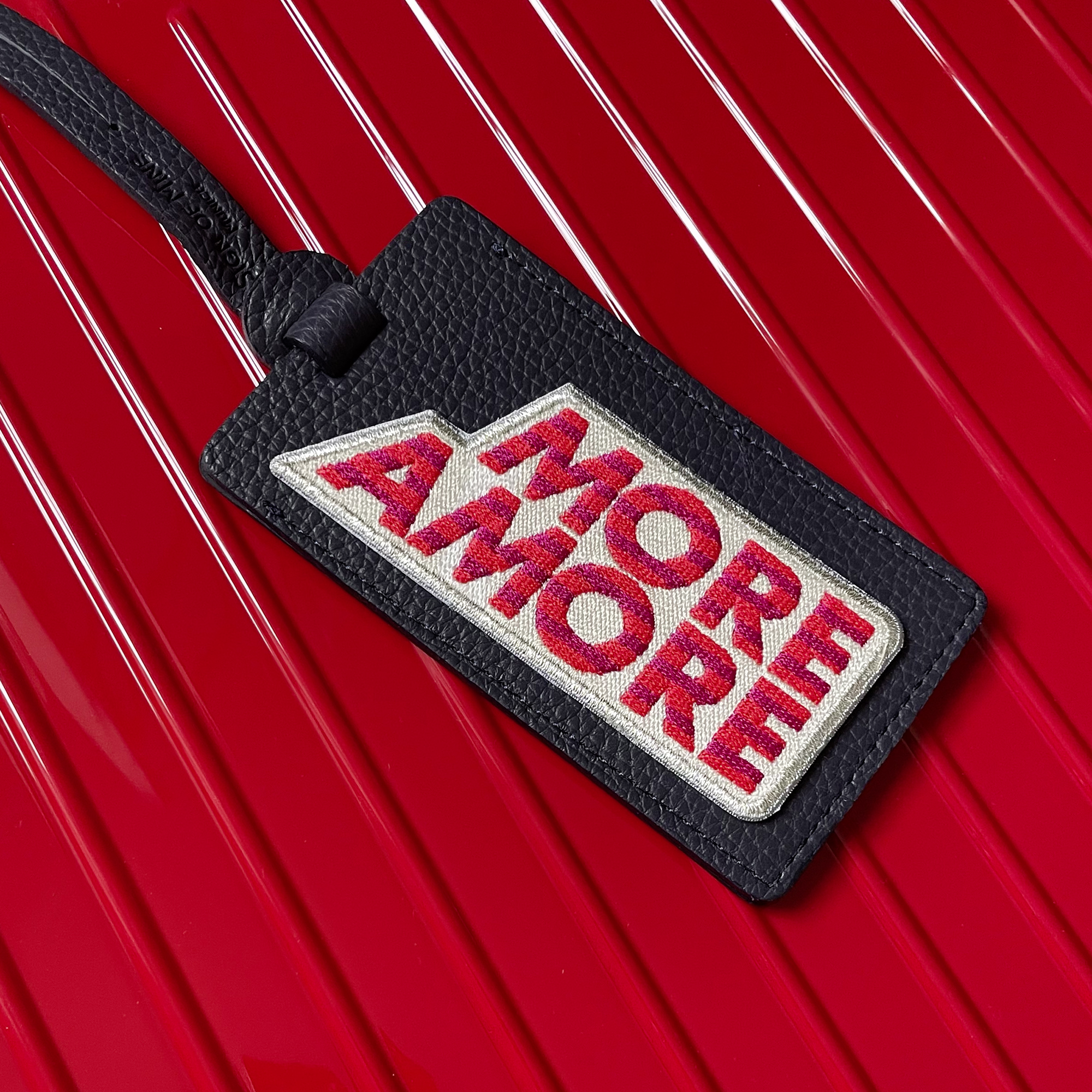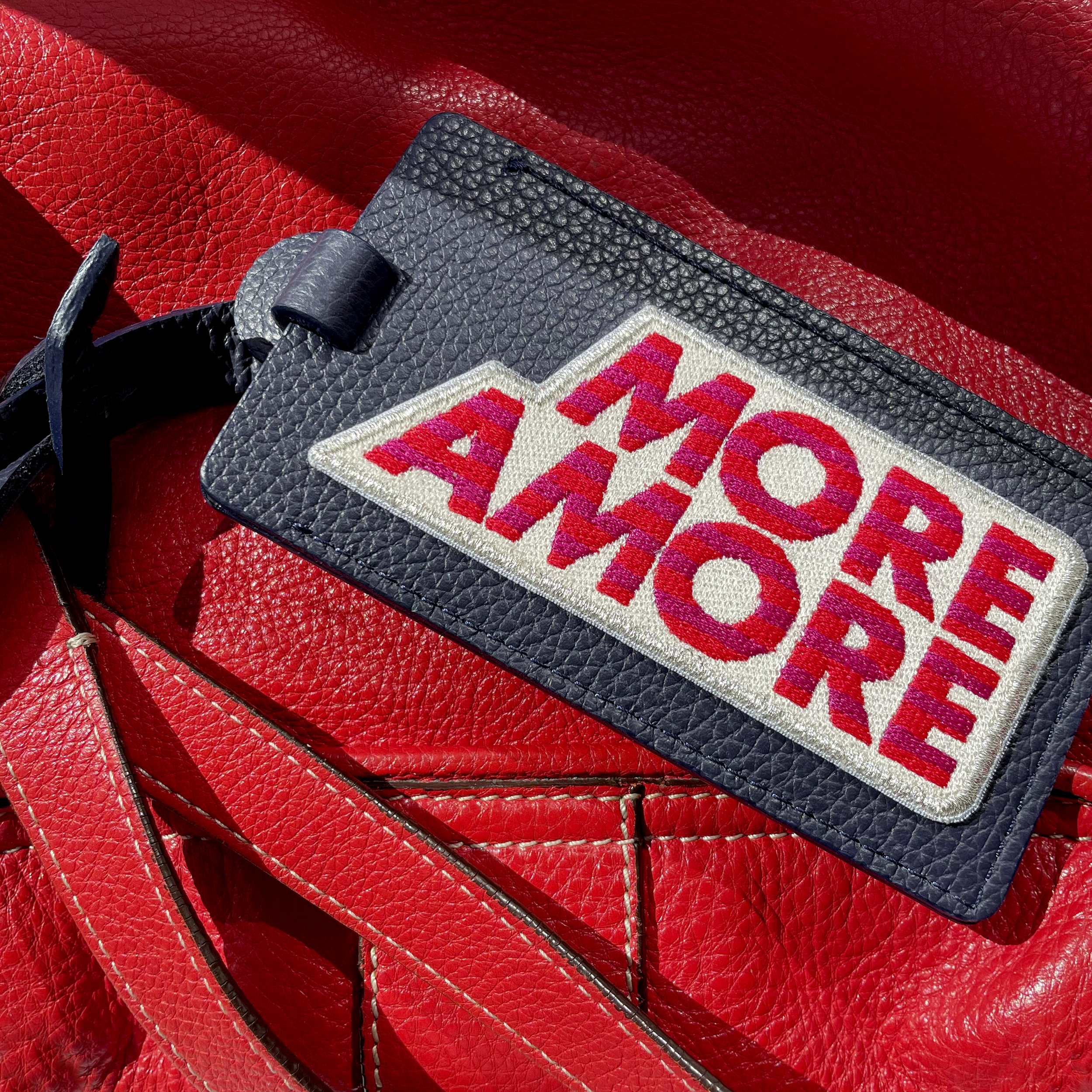 The cheerful luggage-tag MORE AMORE puts you immediately in a good mood and helps - as a good luck charm on your bags and suitcases for all your future travels. ALL WE NEED IS LOVE & MORE AMORE. Luggage tag MORE AMORE transforms your bag, trolley or laptop into an unmistakable unique piece. With the high quality luggage tag made of fine midnight blue calfskin from SIGN of MINE becomes a unique, stylish and recognizable piece of luggage. The label is delicately fully embroidered in red, silver and blue. And in case your luggage should get lost: you can insert your business card into the concealed address field or label the inserted card yourself.
