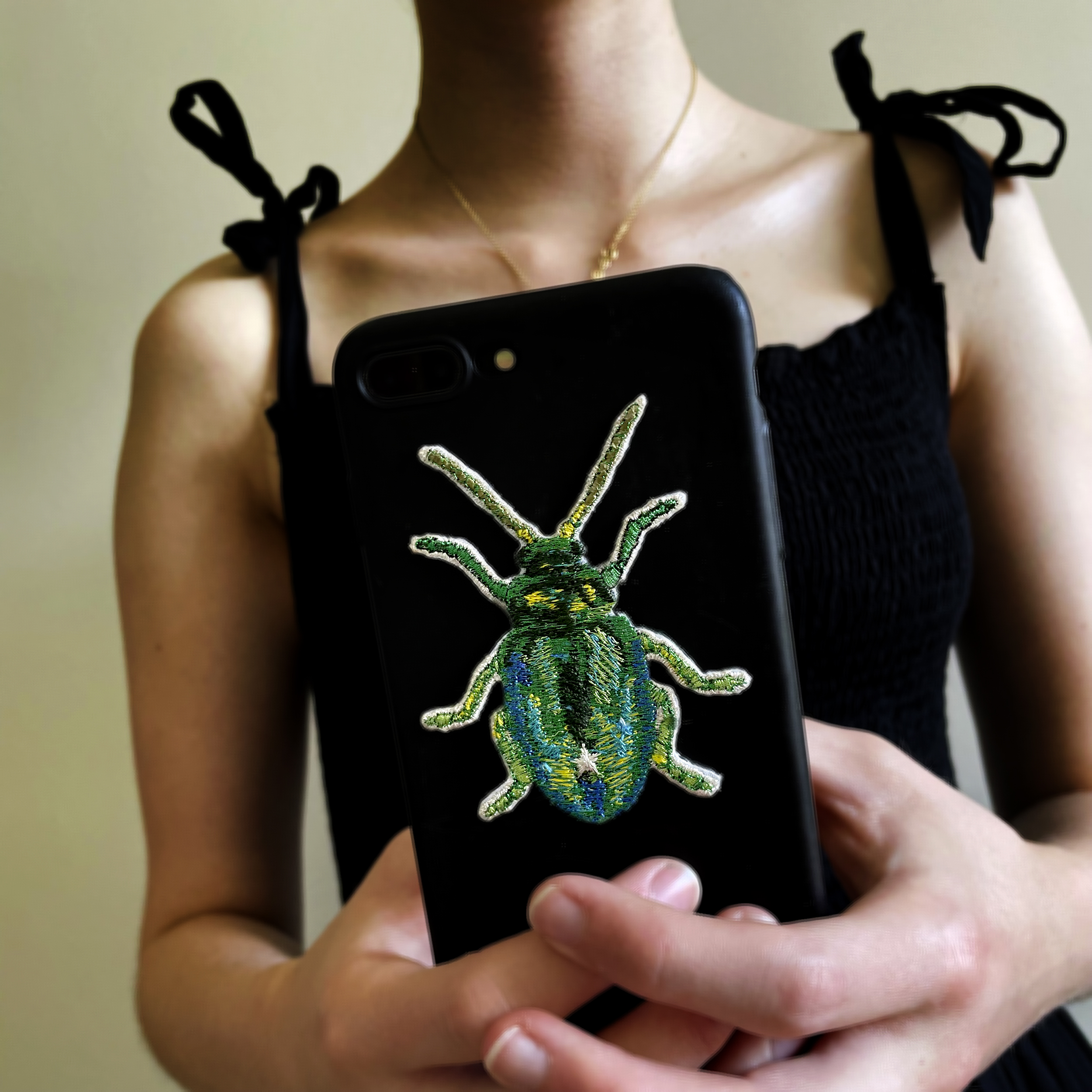 Patch SCARAB is a lucky charm and turns your bag, smart phone, trolley or laptop becomes into a unique accessory! It measures 6.5 x 8 cm and is fully embroidered in metallic green, turquoise and blue shades. The contour shimmers silver.