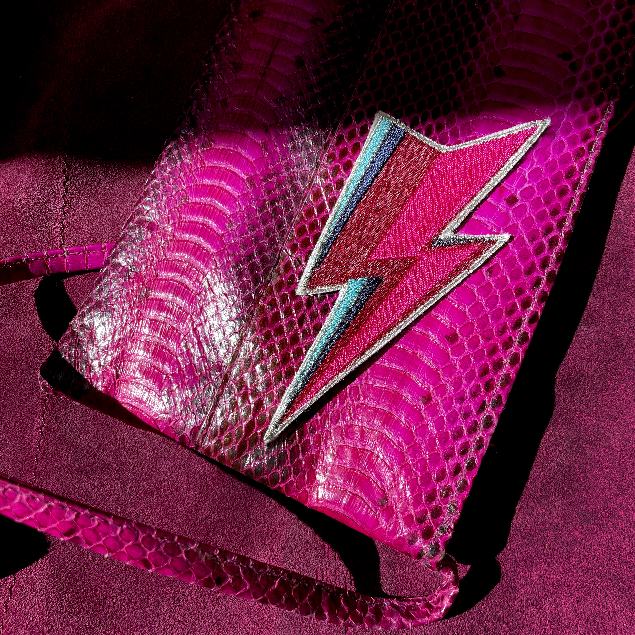 The label FLASH pays tribute to David Bowie aka Ziggy Stardust. He had his face painted with the striking flash for the cover of his album "Aladdine Sane." FLASH measures 11 x 5 cm. The colors: turquoise, navy, dark red metallic, pink and silver. The patch FLASH turns your handbag, leather jacket, trolley or cell phone into a unique piece. The patches are also good on notebooks, folders, laptops, passport covers, photo albums and all other accessories.