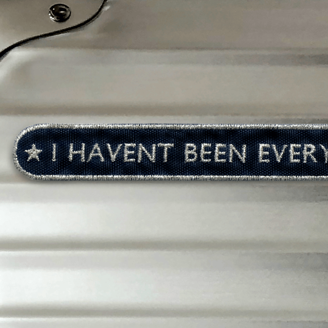 With LUGGAGE PATCH: EVERYWHERE embroidered with the cool saying "I HAVE NOT BEEN EVERYWHERE, BUT IT'S ON MY LIST" by American cult author Susan Sontag, your suitcase becomes a statement and an unmistakable unique piece. It measures 21 x 1.7 cm, fits exactly into the grooves of the suitcase and is embroidered in the colors navy/silver, pink/silver or green/silver.